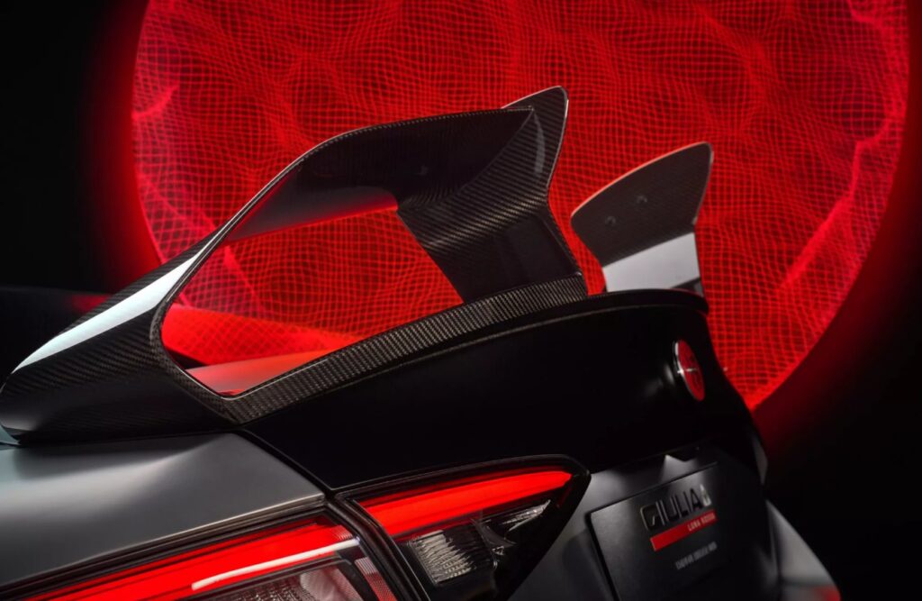 Εντελώς νέα σχεδίαση έχει ο carbon εμπρός προφυλακτήρας με τις πλαϊνές ποδιές να δημιουργούν ένα έξτρα αεροδυναμικό αποτέλεσμα. Εκεί όμως που έδωσαν έμφαση οι μηχανικοί είναι η πίσω διπλή αεροτομή. Μπορεί να φαίνεται τουλάχιστον περίεργη αλλά το συνολικό πακέτο δημιουργεί 140 κιλά κάθετης δύναμης στα 300 χλμ/ώρα! Η μεγαλύτερη που έχει επιτευχθεί σε οποιαδήποτε έκδοση Quadrifoglio.